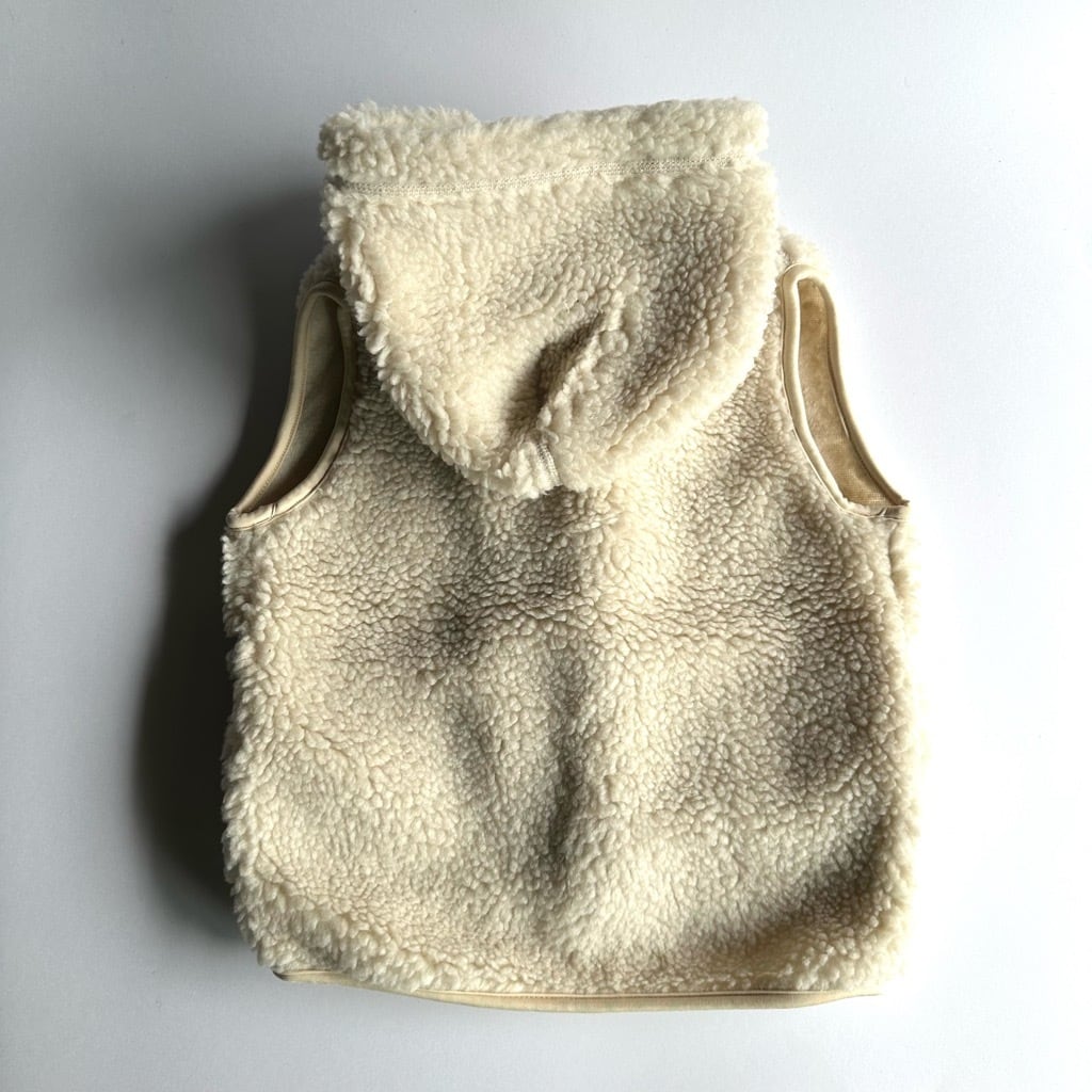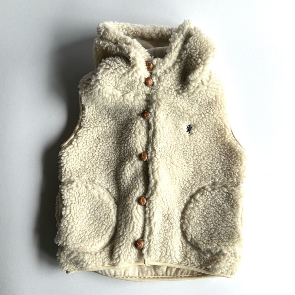 ウッドボタンが可愛いボアベスト。